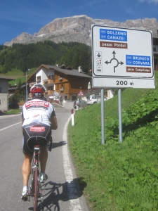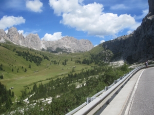 The descent from Passo Gardena is short and sweet, as the road stays high on the shoulder of the Gruppo di Sella and we bypass the towns of Selva di Val Gardena and Plan De Gralba, reaching a low spot at the junction with SS 242 (1870m) on our way to Passo Sella (2240m, climb of 370m).