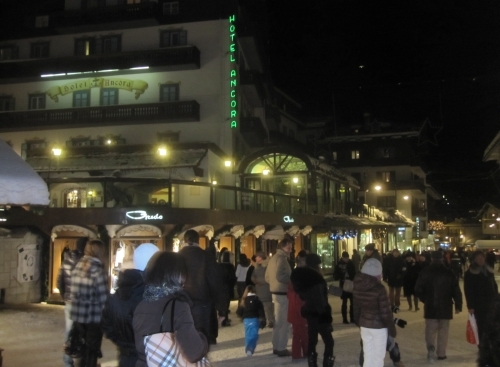 After our fun-filled day on the slopes above Cortina d'Ampezzo, we take a walk through the pedestrian only main street, and enjoy some friendship, festivities, and window shopping before dinner.