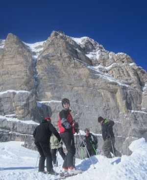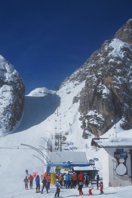 Skiing high up on the Tofana, just below the Ra Valles tram terminal, and below a short descent of the steepest pitch of the Focella Rossa. Far below us, the small town of Cortina d'Ampezzo is nestled in the valley, straddling the torrente (fast creek) Boita. And yes, you can ski all the way to town (near the base of the Freccia Nel Cielo tram terminal).