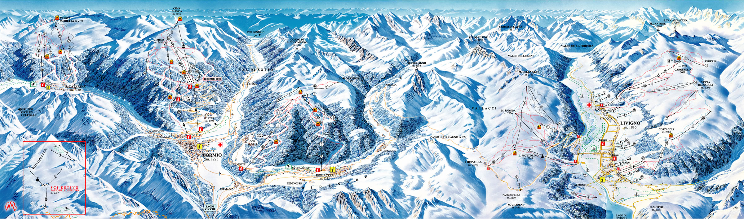 The Bormio skiing area of the Alta Valtellina includes four great resorts served by one Ski Pass: Bormio, Santa Caterina, Oga/Cima Piazzi, and Livigno. Each resort has its own special style, and plenty of great skiing, much of it above tree-line!
